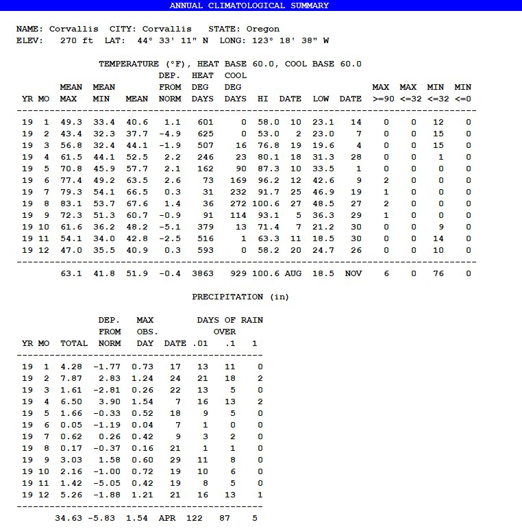 • Rainfall, at 120% of normal, was a bit above average, driven primarily by an extraordinarily wet February and March.  Breaking that down by season, we had 135% of average rainfall during the wet season but only 69% of average from May-September.  Not bad for seed farming, but coupled with low humidity and dry thunderstorms in the Cascades we had one of the worst fire seasons in recent memory.